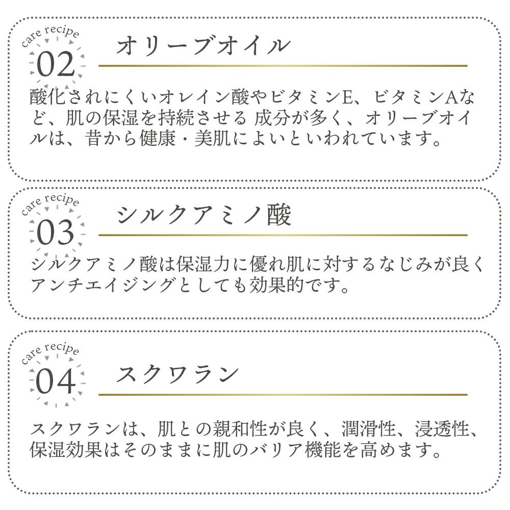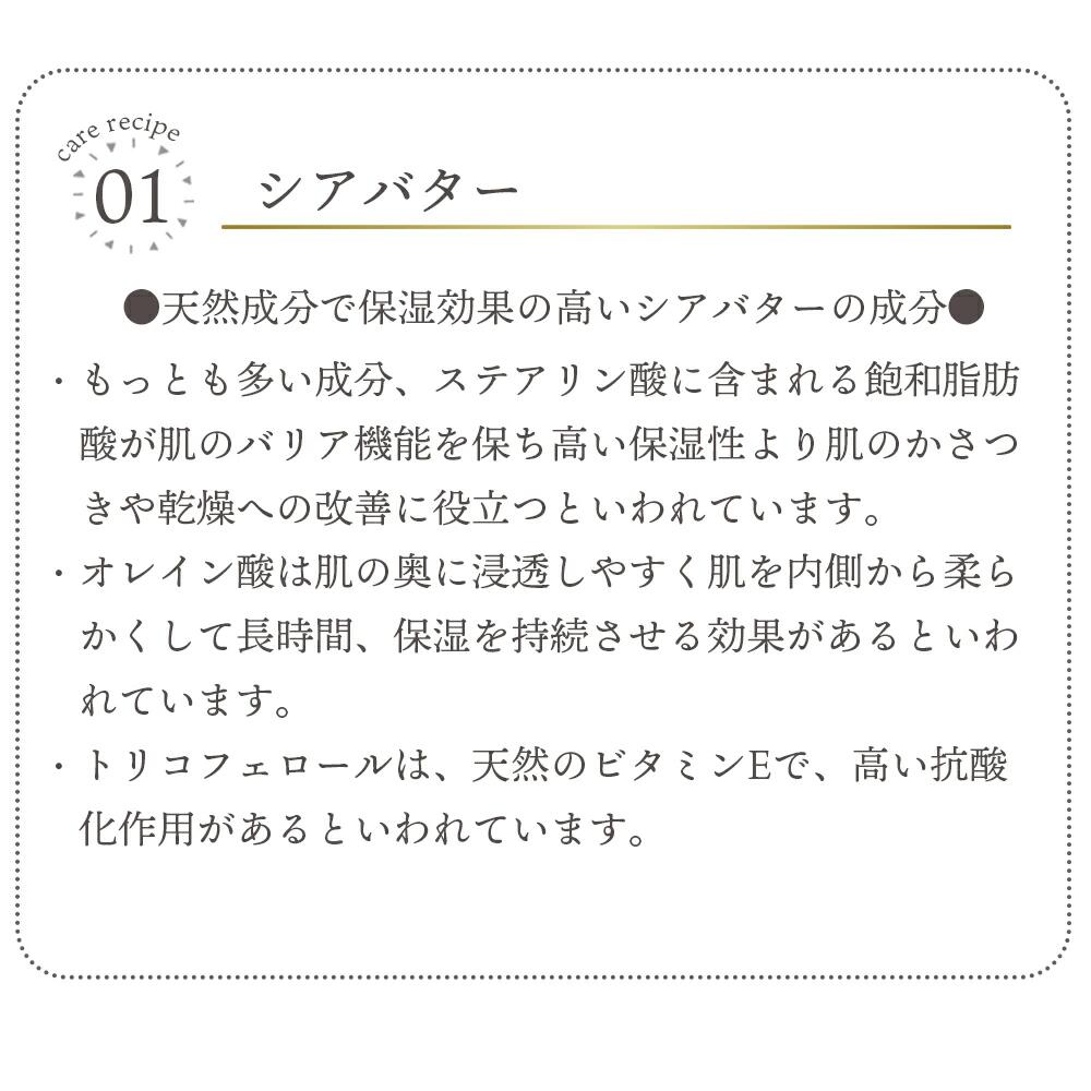 さらにシアバターα加工(シアバター、オリーブ油、シルクプロテイン、スクワランオイルを配合)で美肌や健康に導きます。