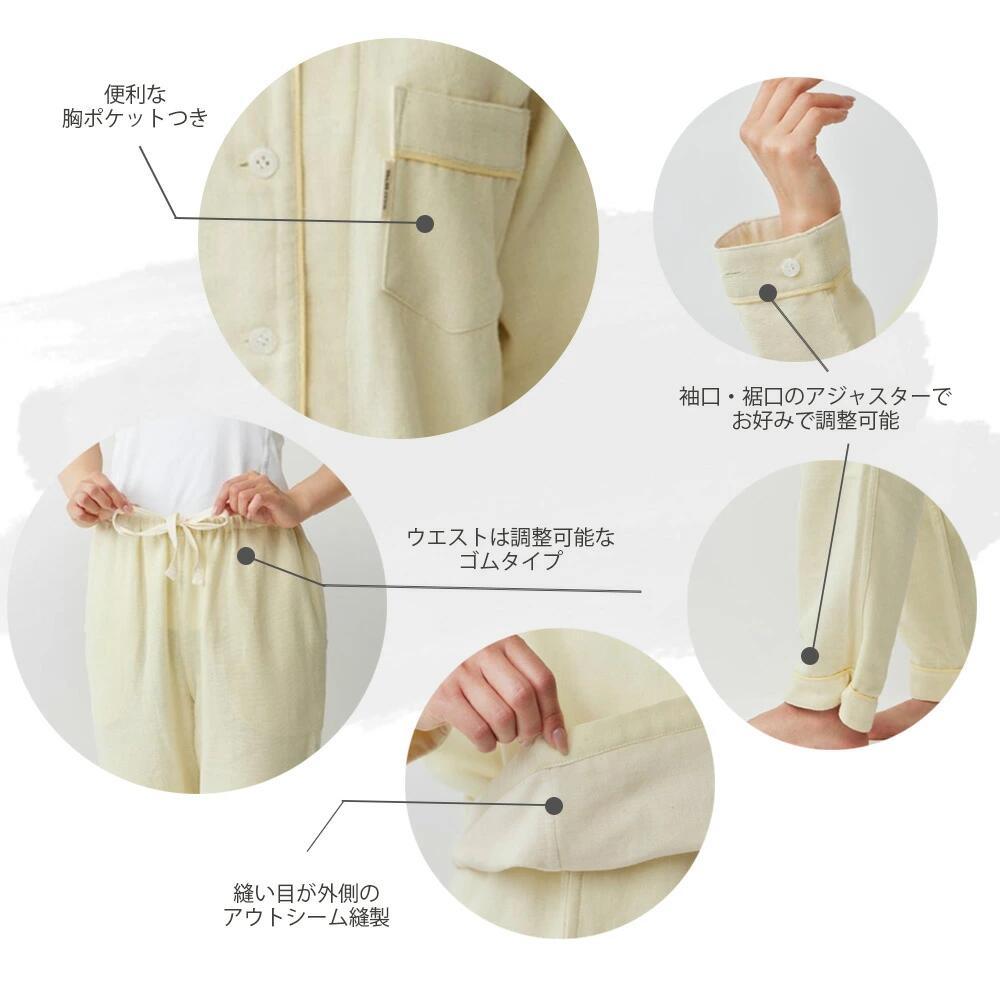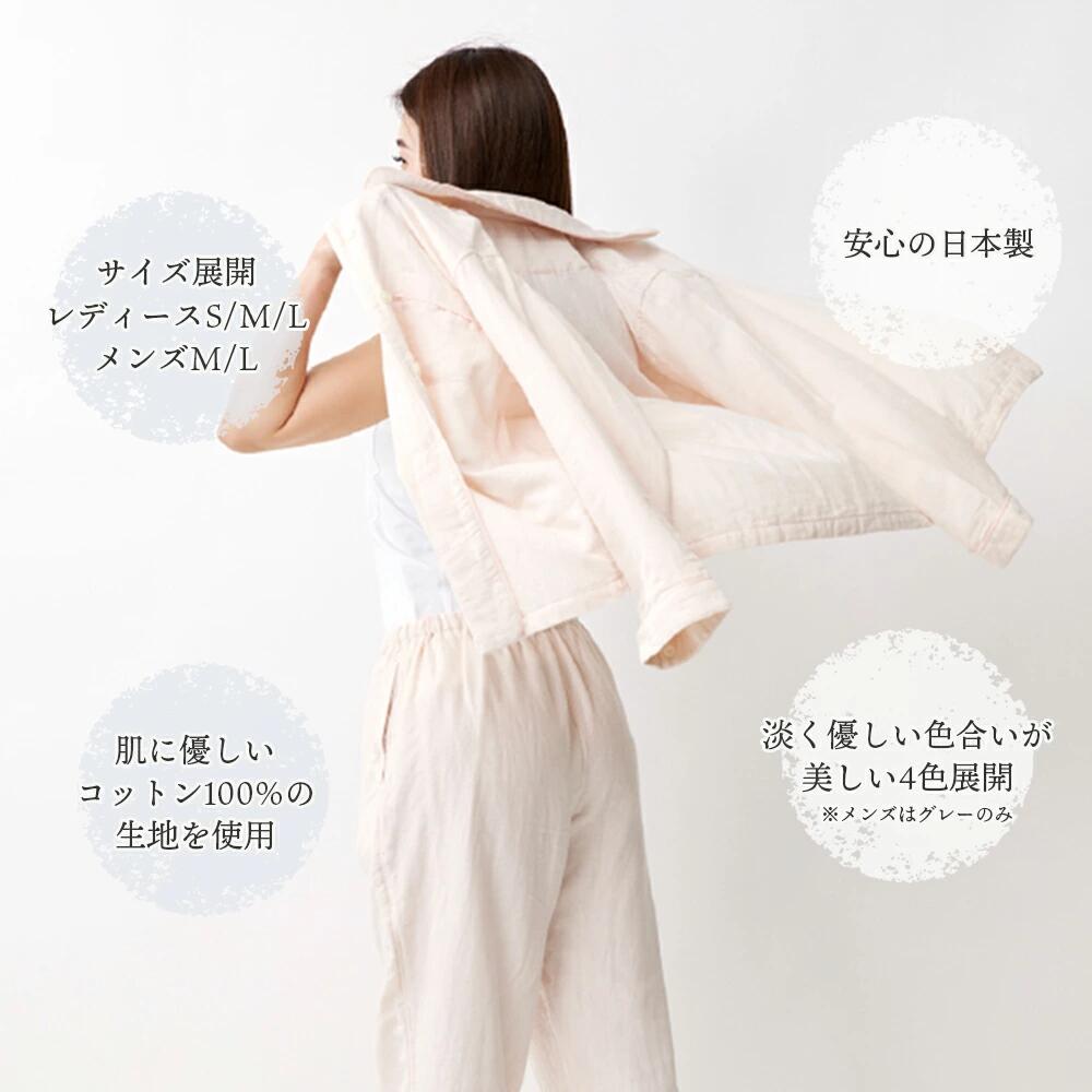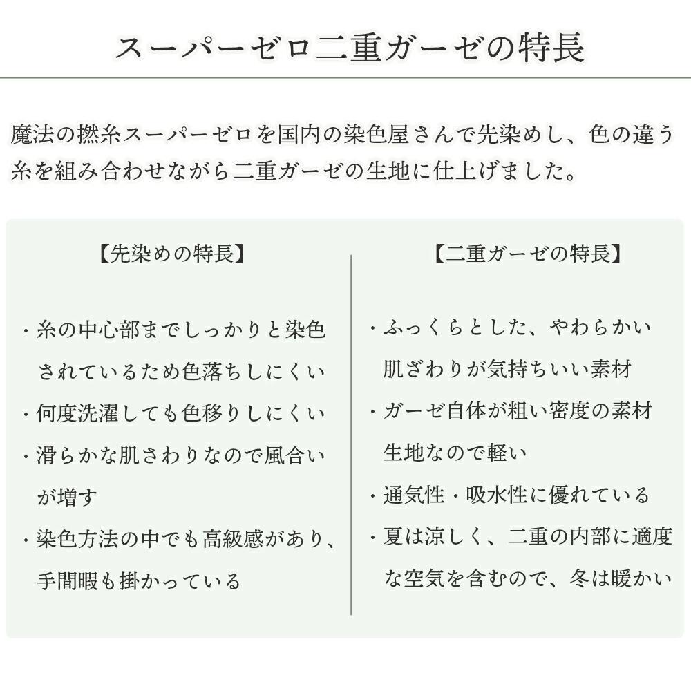 浅野撚糸の「魔法の撚糸スーパーゼロ」を使用の二重ガーゼパジャマ。コットン100%を使用。